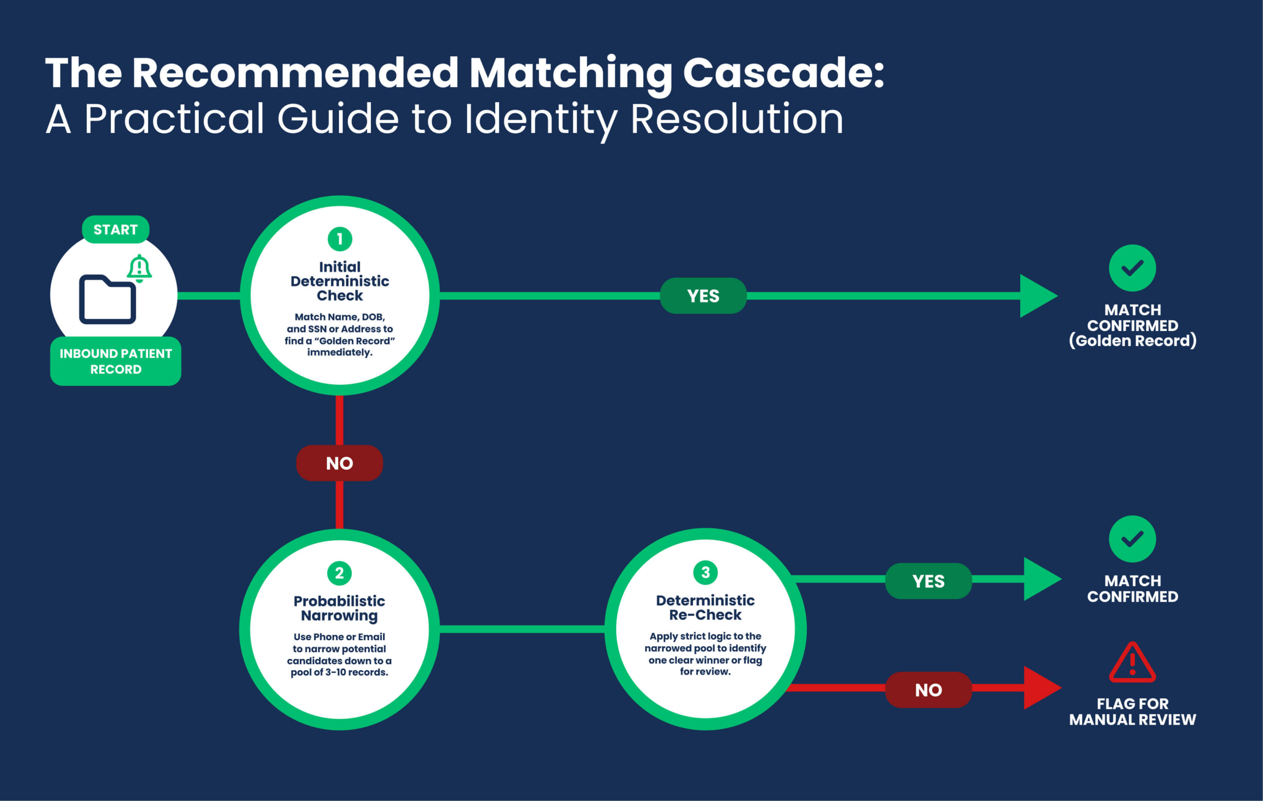 Start with deterministic matching using date of birth along with SSN or address with longitudinal history. If that fails, use probabilistic methods like phone and email to narrow your candidate pool to 3-10 records. Then re-apply deterministic strategies to that smaller set. This cascade approach maximizes accuracy while minimizing manual review burden.