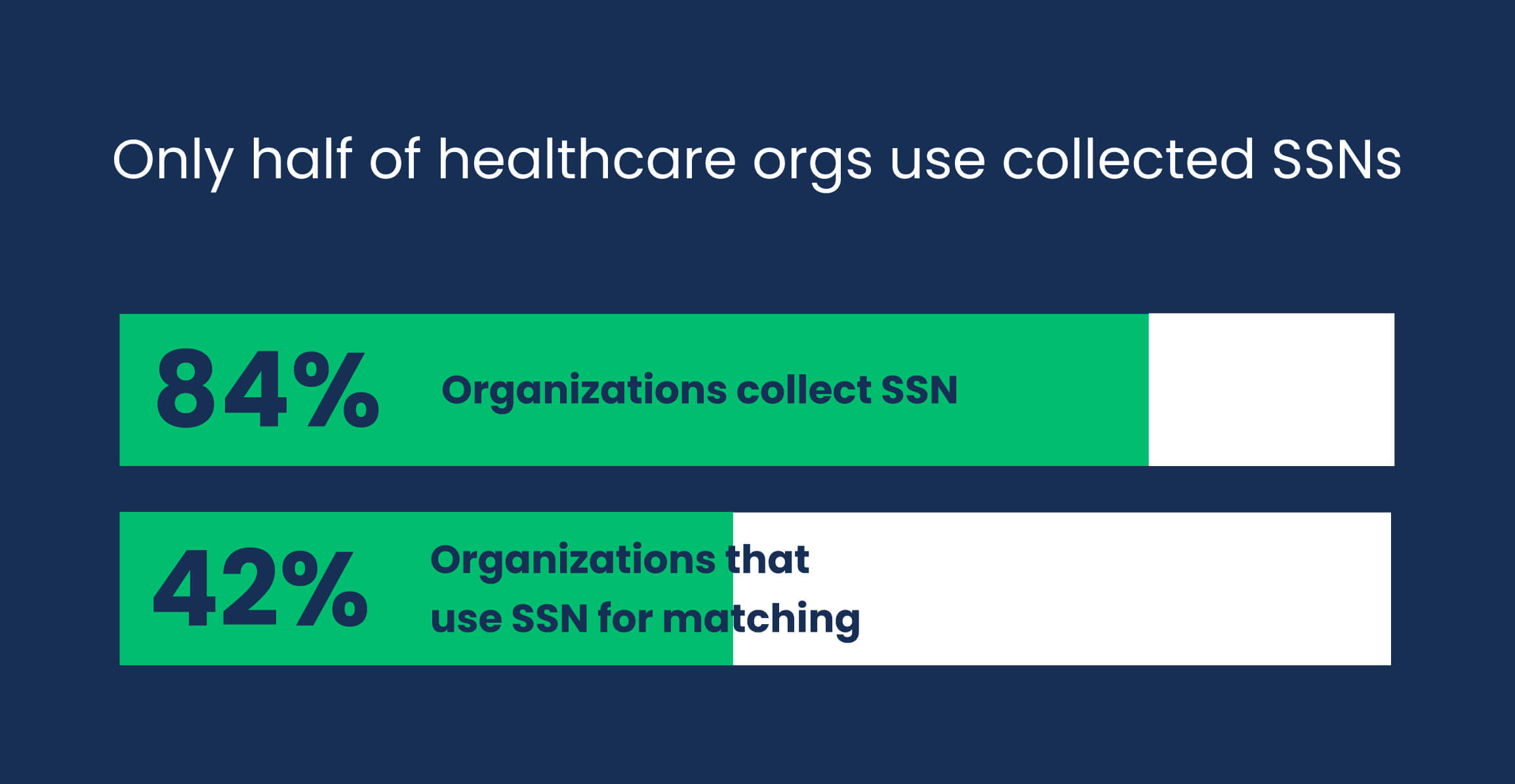 Healthcare organizations should match on DOB and SSN first as those identifiers are highly stable. Names can change over time, and nicknames can complicate matters, so the healthcare organization should match on DOB and SSN and then have appropriate feedback loops to resolve name change history. Ideally, CSPs will provide names, including nicknames and aliases, and name change history so any discrepancies can be resolved without making the patient do more work. 84% of healthcare organizations collect SSNs but only 42% use them for patient matching. By matching on this attribute bundle alone, deterministic patient matching can dramatically improve—empowering patients and providers alike and enabling interoperability.