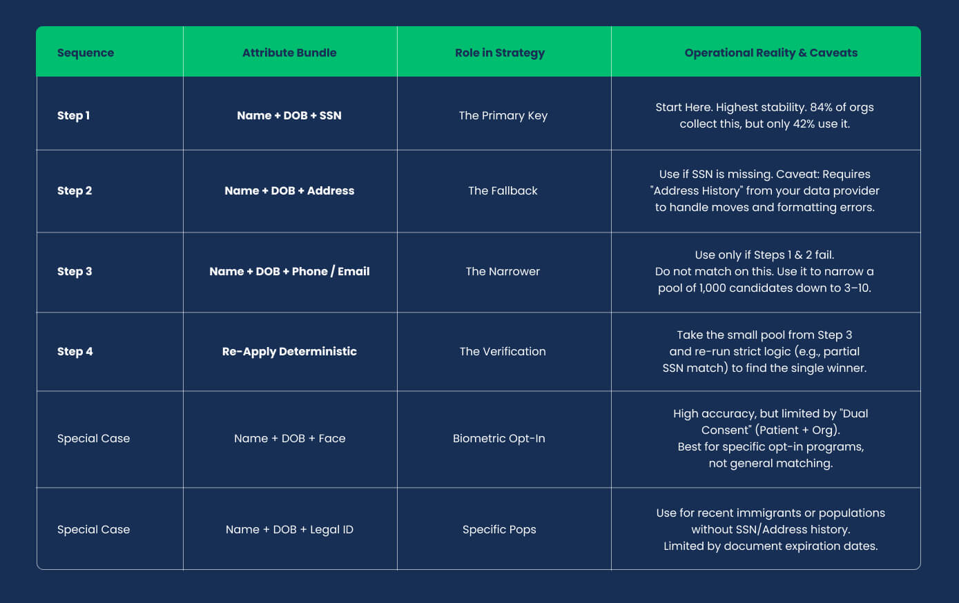 Getting patient matching right requires understanding which attribute combinations provide deterministic matches versus those that merely narrow the search. Let’s break down the logical keys that healthcare organizations should prioritize.
